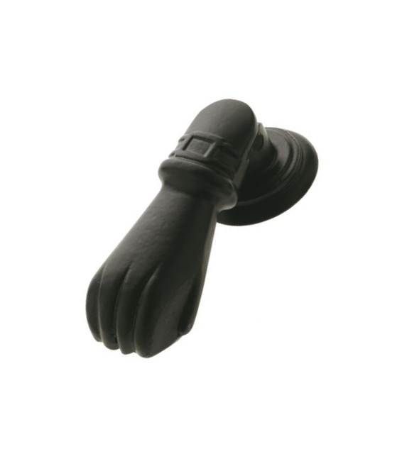 Aldaba rústica con forma de puño fabricada en acero y zamak, acabado color negro. Perfecta como llamador de puertas o portones de entrada de estilo rústico. Es una alternativa a los timbres convencionales para dar un toque vintage y diferente a las puertas de entrada.