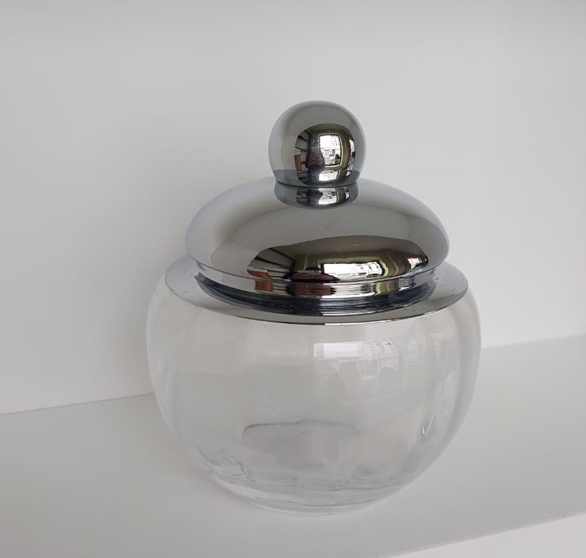 Algodonera cristal. Medidas: Diámetro 10 cm x 13 cm altura. Tapa algodonera en cromo brillo.