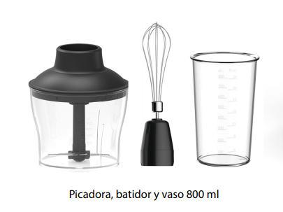 - Incluye accesorios: picadora, batidor y vaso de 800ml.