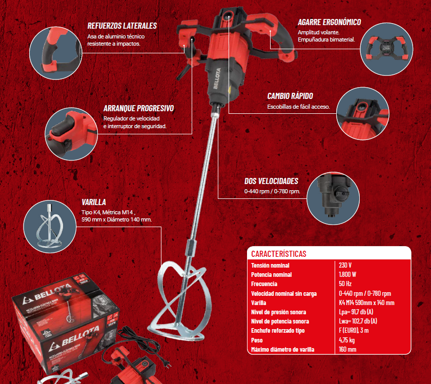 Incluye una varilla K4 M14 de 140 mm de diámetro y 590 mm de longitud. Para realizar mezclas homogéneas de morteros, cementos, resinas, pinturas y colas.