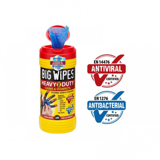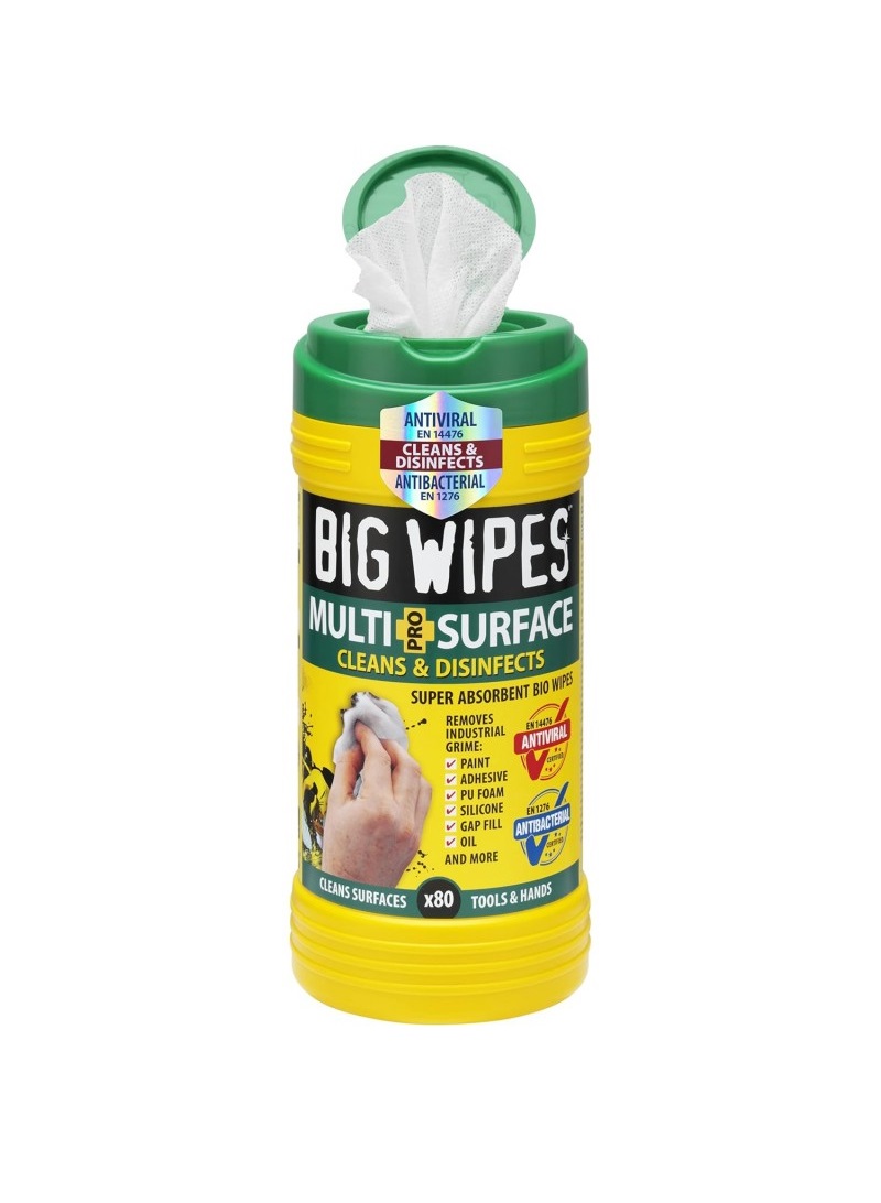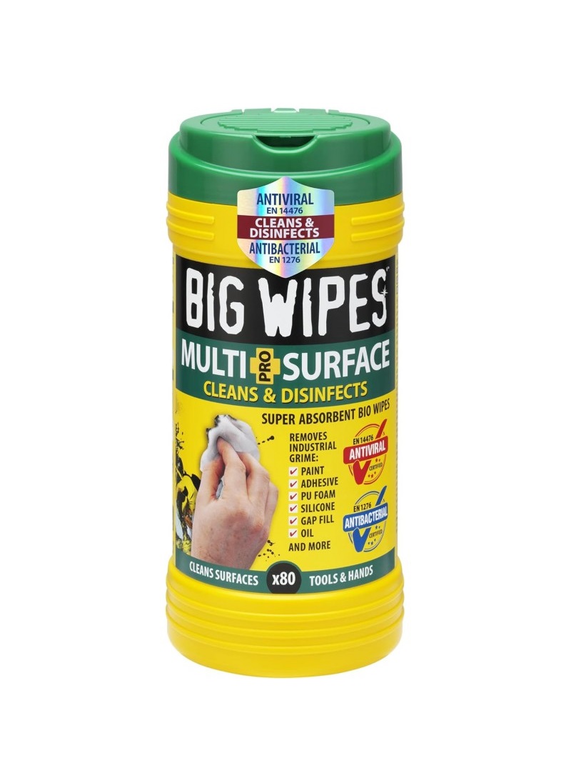 iva incl.Las Toallitas Limpiadoras Big Wipes 80 limpian y absorben sin dañar las manos. Limpian pintura, adhesivo, espuma de poliuretano, silicona y aceite, tanto en las manos como en herramientas manuales y superficies.