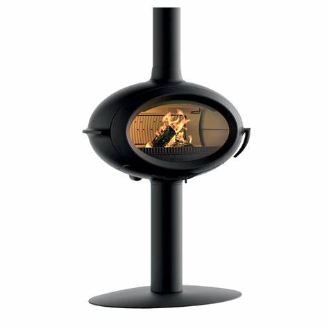 Desde lo alto de su columna central de hierro fundido, esta estufa de leña revela su inmenso talento.