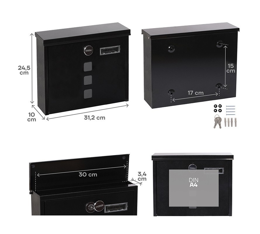 - Para correo DIN A4 y revistas: con capacidad para correo tamaño DIN A4. Caben en posición horizontal revistas, catálogos y hojas A4 sin doblar.