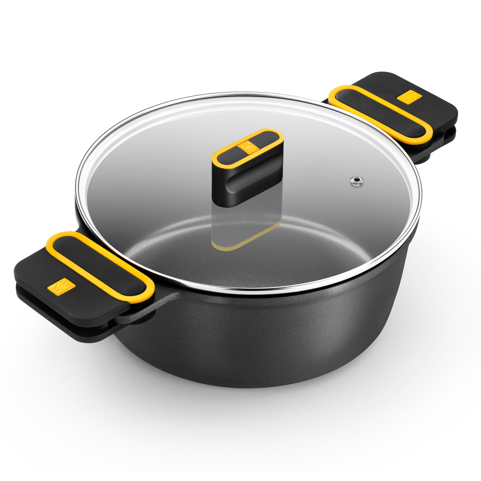 Fabricada en aluminio fundido de la mejor calidad, muy resistente a la deformación y 100% reciclable. Revestimiento antiadherente tricapa de Chemours Teflón Innovation, 100% libre de PFOA y totalmente respetuoso con el medioambiente. Fondo full induction compatible con todas las fuentes de calor incluida la inducción. Cuerpo apto para horno hasta 220 °C (usar en el horno sin la tapa de cristal y las asas de silicona). Incluye tapa de cristal y asas de silicona.Tapa de cristal con pomo de baquelita y detalles en color amarillo.Asas de silicona en color negro con detalles en color amarillo. Fondo difusor de 4,5 mm de espesor con disco de acero inoxidable magnético 18% cromo, unido por sistema de impacto. Cuerpo de la cacerola con menor peso sin perder robustez ni fortaleza.