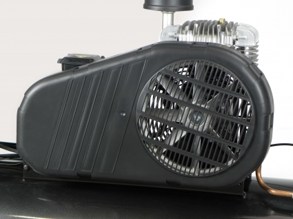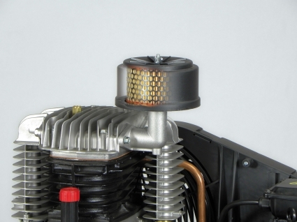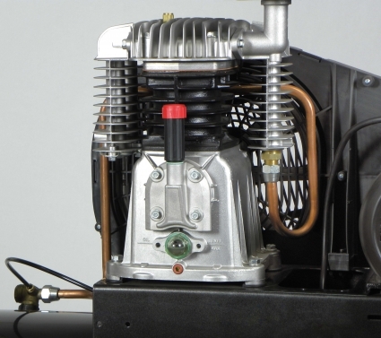Grupo cabezal de doble etapa con cilindro de hierro dotado de amplios colectores entre etapas y posterior aleteado para mayor refrigeración.