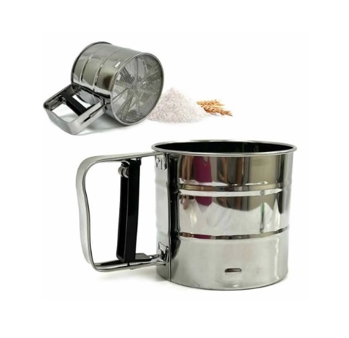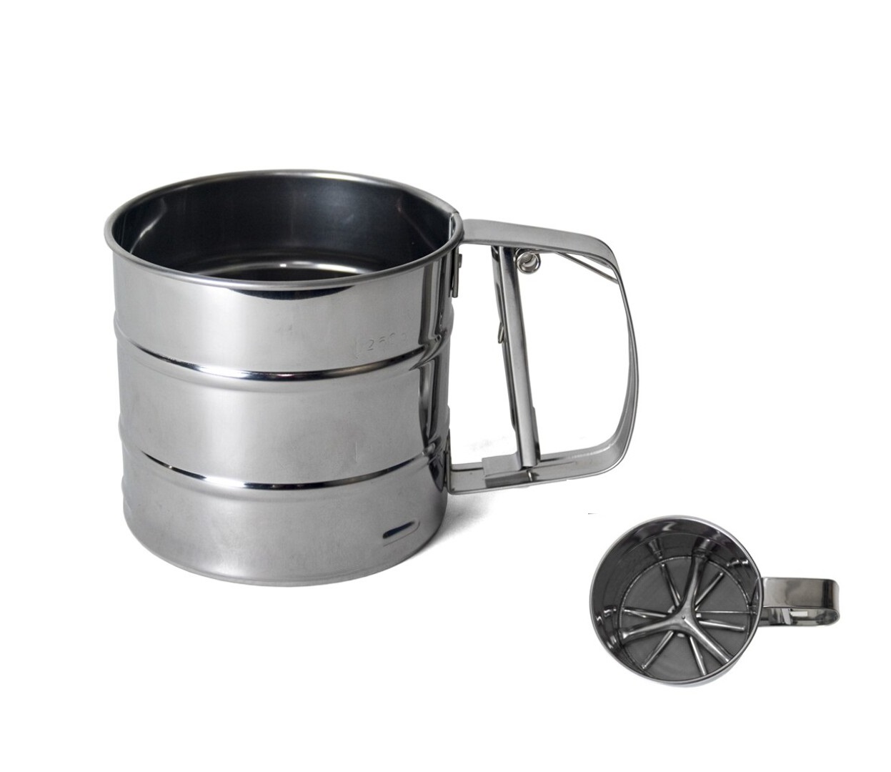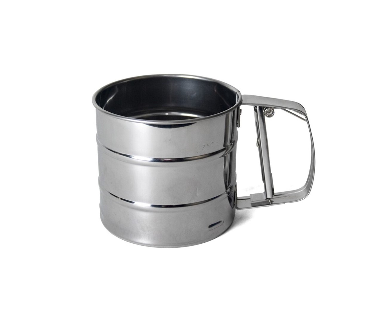 Tamiz con molinillo para tamizar harina, azúcar en polvo u otros productos a granel. Material: acero inoxidable. Dimensiones: 16 X 10 X 10 cm. Pomo con palanca presionada.