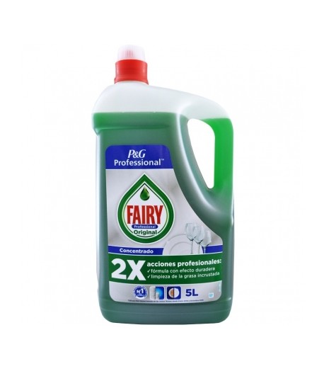 Fairy Professional Líquido Lavavajillas Original es un detergente líquido concentrado diseñado para lavar y remojar previamente la vajilla, las ollas, las sartenes, los utensilios de cocina y otras superficies. Solución de lavado duradera y eficiente.