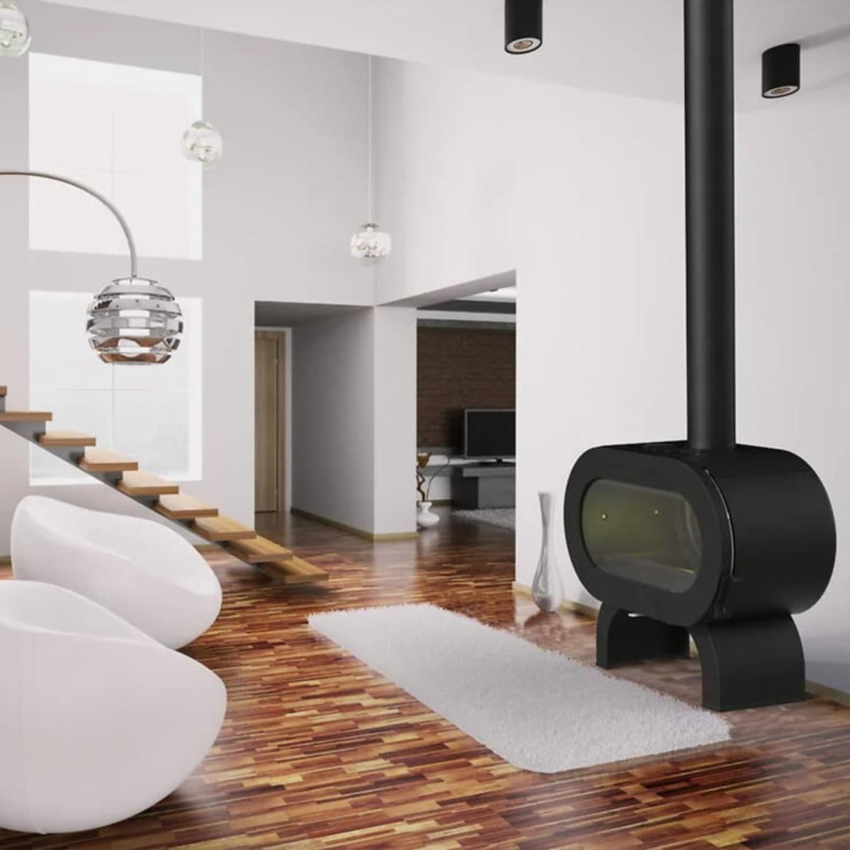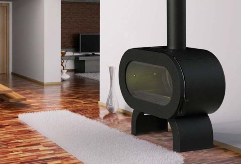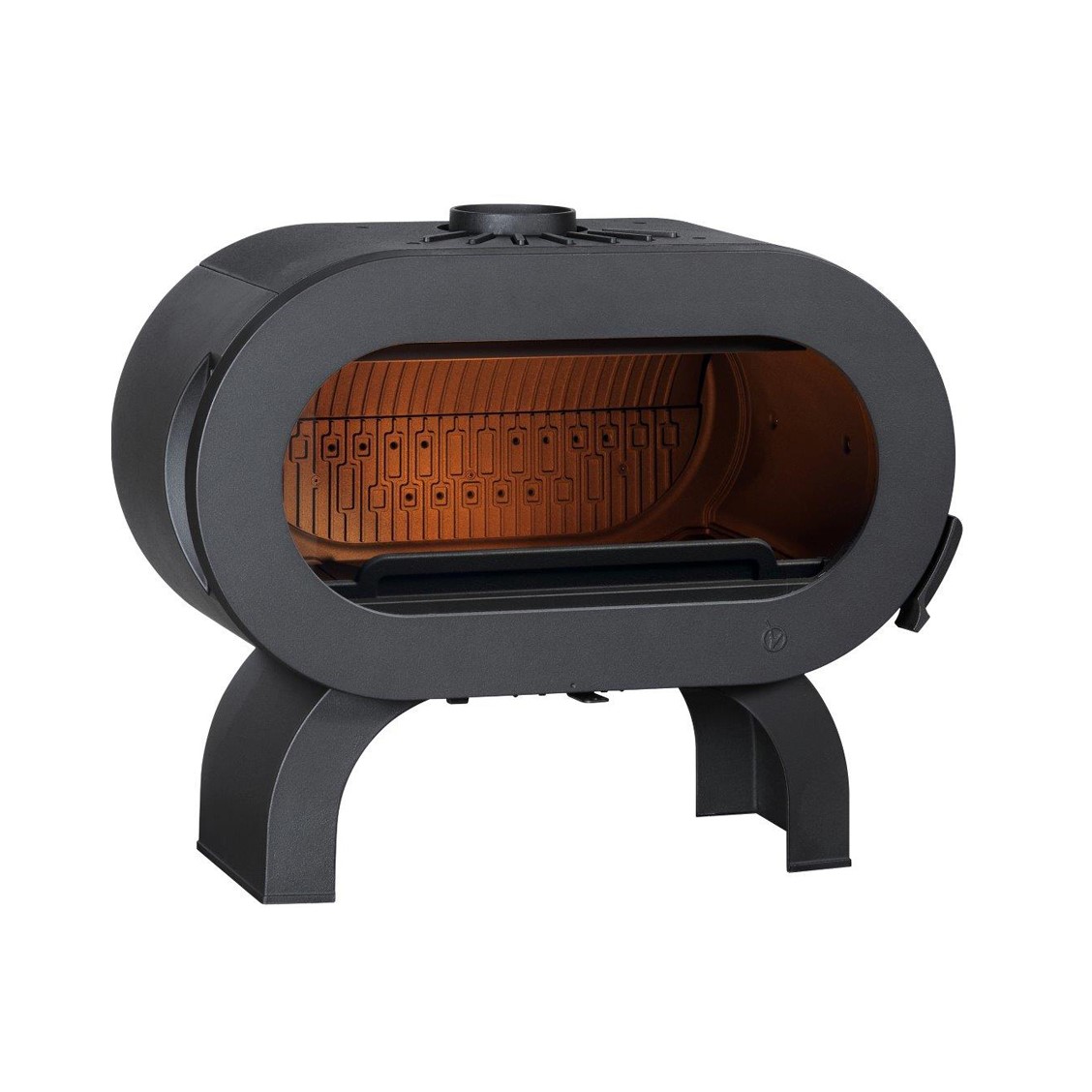 Posada sobre su arco redondeado, esta estufa te transporta al estilo de los años 50 y en la eficiencia energética del futuro.