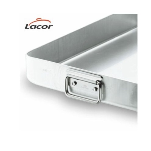iva incl.Esta rustidera o bandeja para el horno de aluminio con asas abatibles o fijas, está fabricada por Lacor utilizando aluminio puro 99.5% de gran espesor y asas atérmicas en acero inoxidable 18/10 en el caso de las fijas.