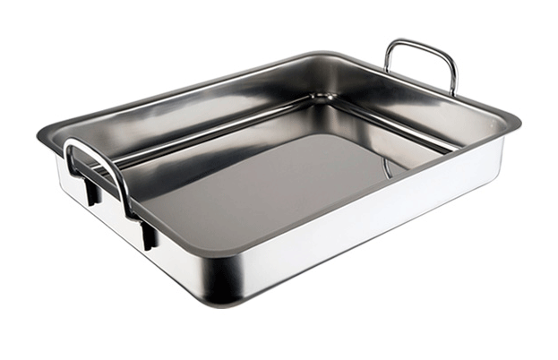 Bandeja rectangular de acero inoxidable ideal para asados. Resistentes a temperaturas del horno convencional. Asas fijas, fuertes y resistentes para facilitar su manipulación. Apta para lavavajillas.