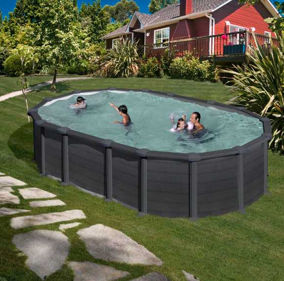 - Piscina ovalada de pared de acero con decoración de grafito