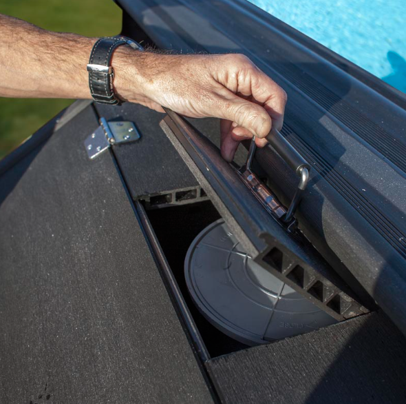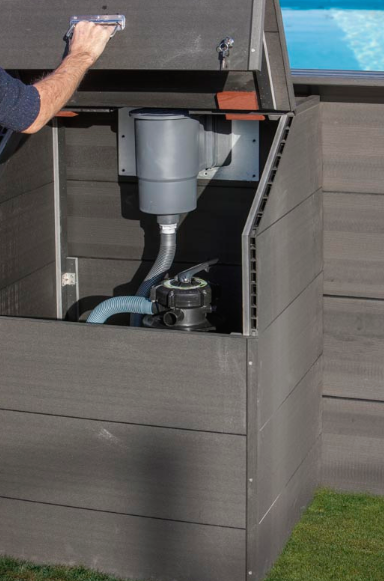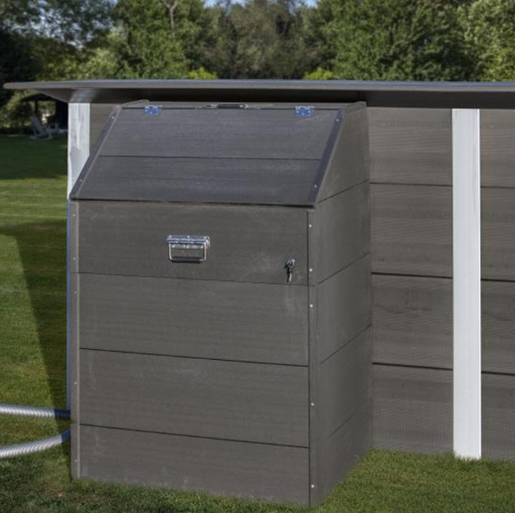 Esta gama de casetas de composite está disponible en una sola altura que se adapta perfectamente a la altura de la gama de piscinas de composite Avantgarde de GRE. Estas casetas están diseñadas para evitar que los diferentes accesorios de piscinas (depuradora material de limpieza ligero limpiafondos manguera...) se queden ubicadas en el exterior con los riesgos que puede conllevar. Adicionalmente es una manera estética de esconder estos diferentes accesorios que habitualmente se quedan en el jardín. Se pueden colocar pegadas a la piscina o separadas ya que tienen todas las paredes para que los accesorios de piscinas queden protegidos.