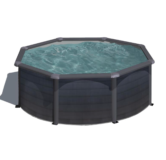 Una piscina para toda la familia con un nuevo diseño con decoración grafito que sigue las tendencias actuales. Se instala fácilmente sin necesidad de solera de hormigón. El kit esta entregado con todo el equipamiento necesario para montaje: pared de acero tratado Anti-UV, liner, skimmer, filtro de arena y escalera.