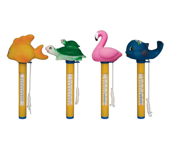 iva incl.GRE ofrece una amplia gama de termómetros para medir la temperatura del agua de la piscina: termómetros integrados en el dosificador flotante lo que le permite tener una doble función termómetros que se pueden fijar a la escalera para evitar de estar flotando al medio de la piscina y molestar a las personas que se bañan. Nuestra gama de termómetros está disponible en diferentes diseños: convencionales y más divertidos con figuras de animales.