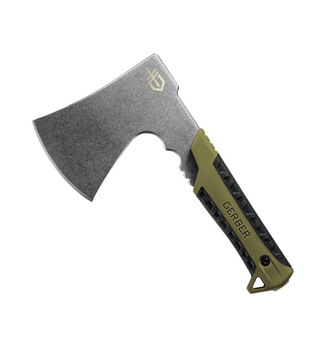 Hacha de caza Gerber Pack con hoja de acero inoxidable y mango ergonómico de goma. Funda incluida.