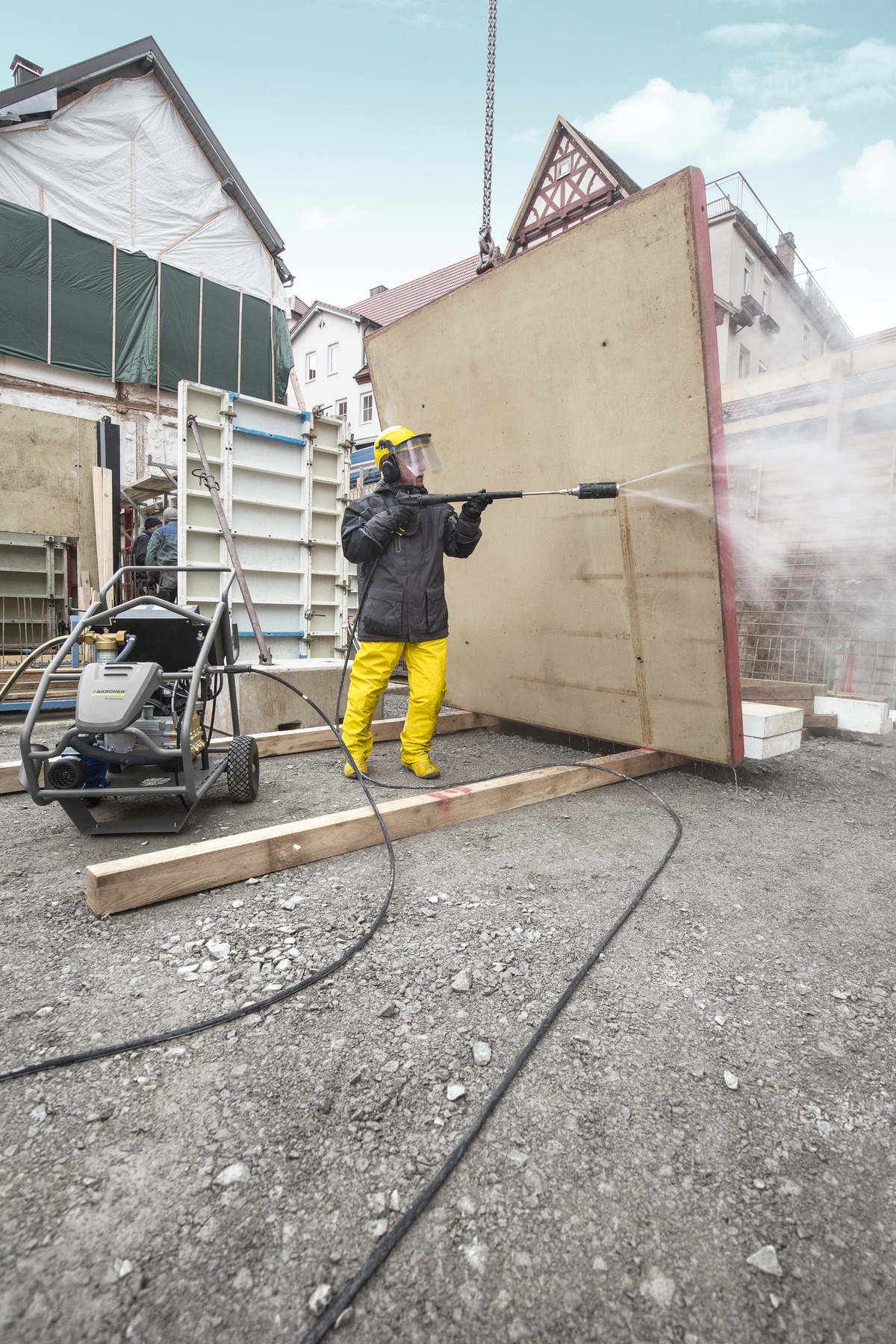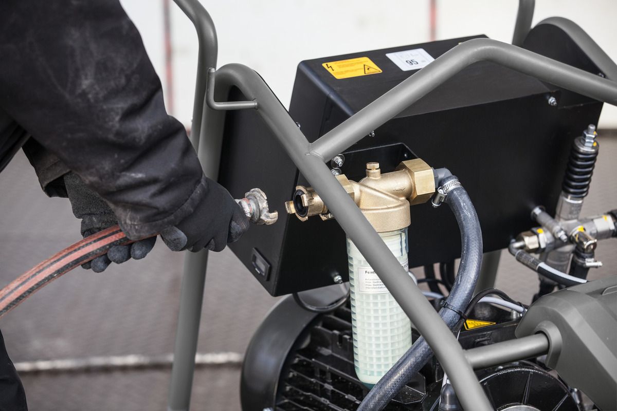 Con una presión de trabajo de hasta 500 bar, este equipo elimina incluso la suciedad persistente. El robusto diseño de la Cage lo hace especialmente estable: se puede cargar con grúa, además, los componentes están protegidos por todos lados. Muchas otras ventajas hacen de este equipo la primera opción para uso profesional. Práctico y cómodo: gracias al portalanzas y al gancho integrado para la manguera, el equipo siempre tiene sus accesorios a punto. El contador de horas de servicio indica los tiempos de marcha exactos de la bomba. Almacenamiento seguro: accesorios y herramientas se guardan en un compartimento protegido. Fácil de transportar: el principio de carretilla para sacos permite transportar los equipos más fácilmente que los equipos de cuatro ruedas, sobre todo en terreno impracticable, como en las obras. Fiable y segura: la bomba de cigüeñal de máximo rendimiento KÄRCHER proporciona la presión necesaria. Una protección opcional contra falta de agua protege tanto al usuario como a la bomba.