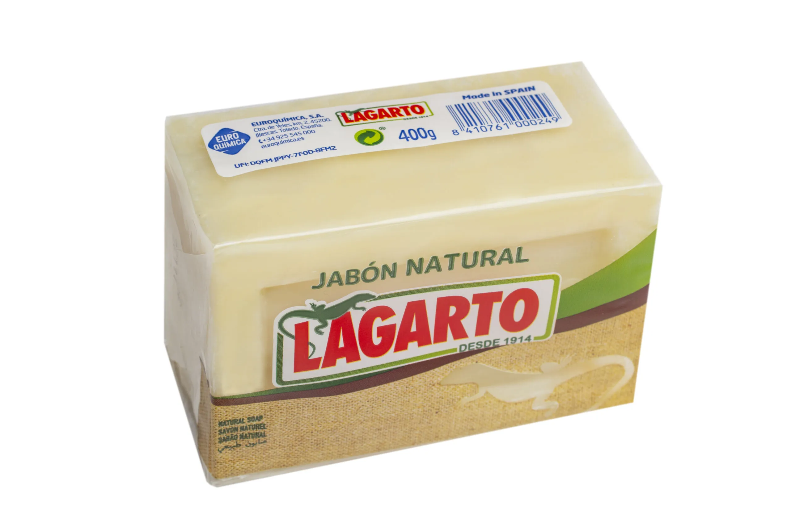 Jabón natural al 100%. Auténtico jabón LAGARTO.Eficaz contra todo tipo de manchas y cuidadoso con los tejidos. Producto respetuoso con el medio ambiente pues es 100% biodegradable.