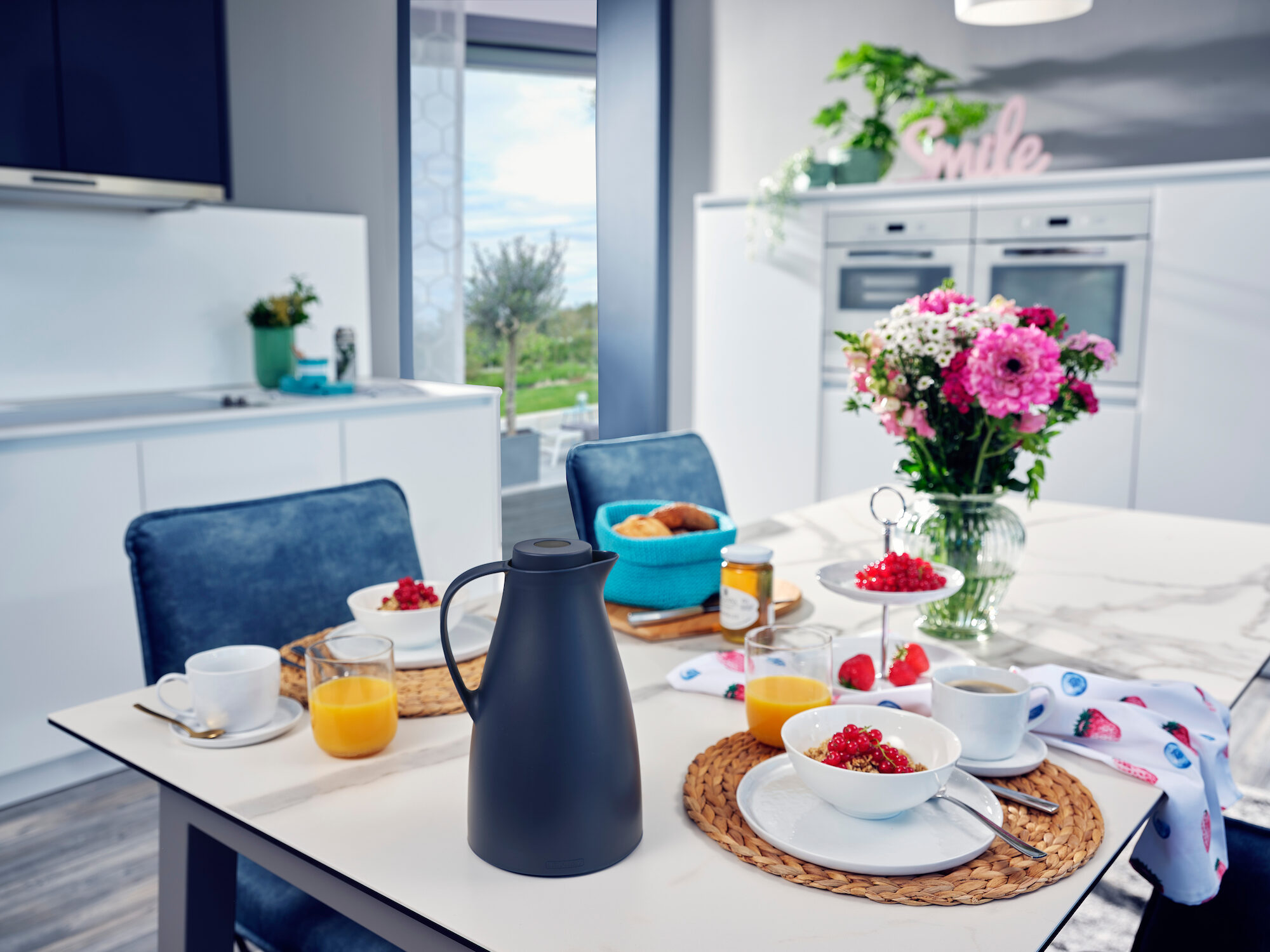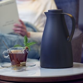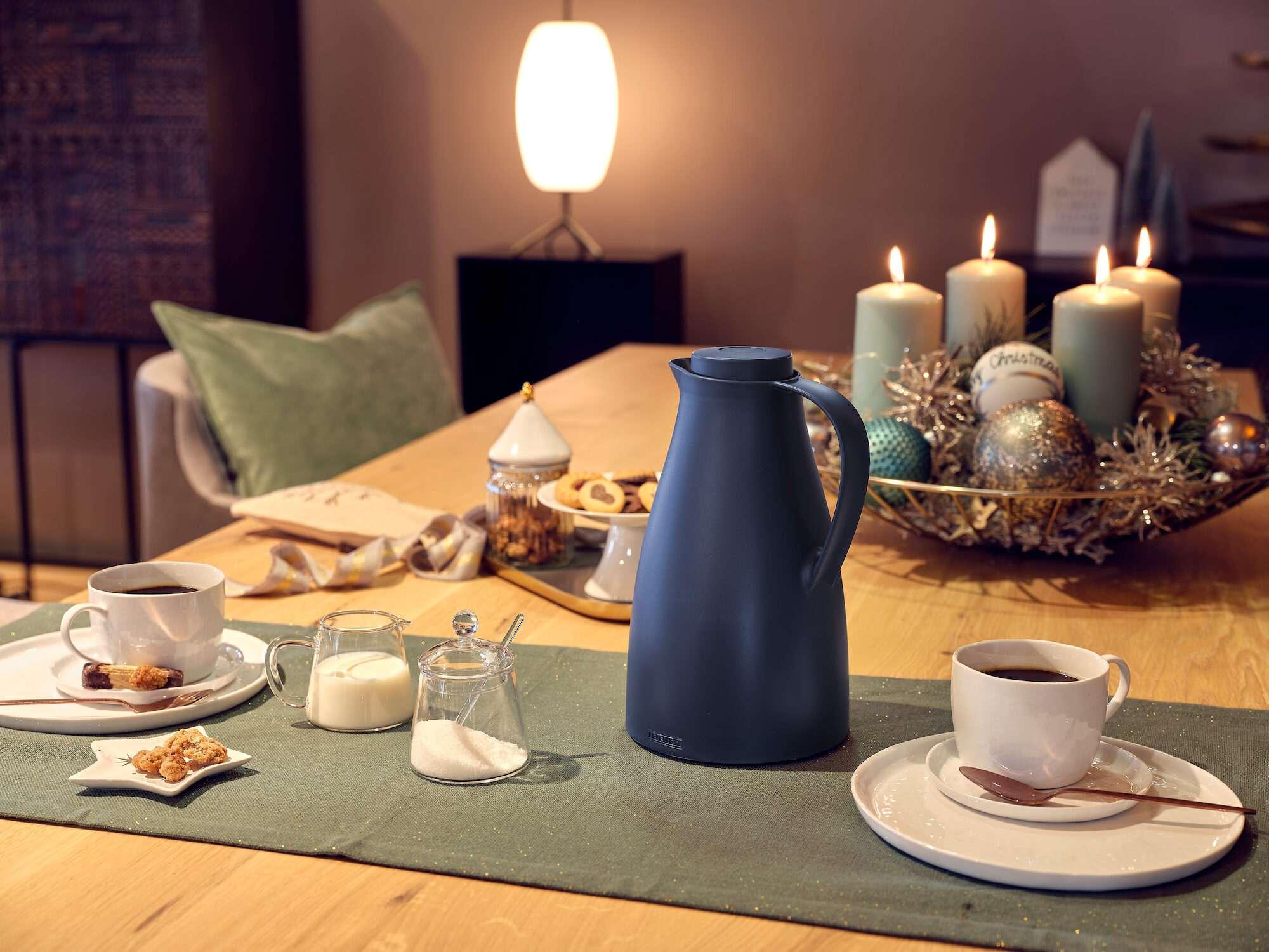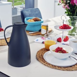 En verano o en invierno, el termo Harmonic azul con 1 l de capacidad es un accesorio práctico y sorprende por su gran capacidad aislante: el émbolo de vidrio de doble pared que se encuentra en el interior del termo permite mantener las bebidas calientes hasta 24 horas y frías hasta 36 horas. En el centro de la tapa se encuentra un tapón de presión Aroma muy fácil de abrir y cerrar: Solo hay que pulsarlo hacia abajo para abrir el termo y servir fácilmente el té o el café. La altura del pulsador indica si el termo está abierto o cerrado. Gracias al asa ergonómica y a la boquilla curva, es muy fácil verter el contenido. La tapa de rosca del termo es fácil de usar y garantiza un cierre hermético al 100 %. Así, es imposible derramar el contenido accidentalmente. Naturalmente, el termo no contiene BPA. Con su diseño clásico y sus detalles modernos, encaja a la perfección en cualquier hogar.