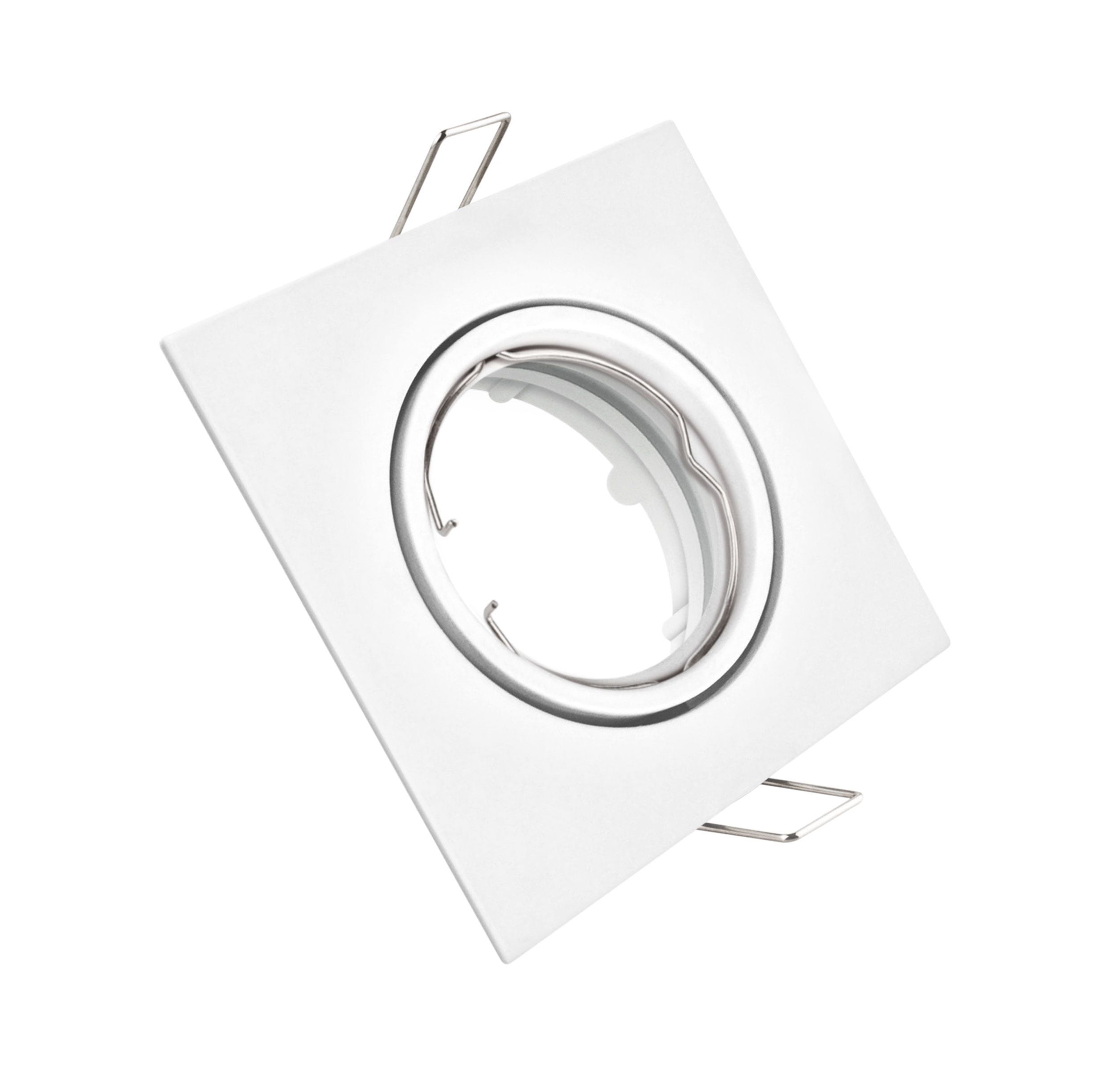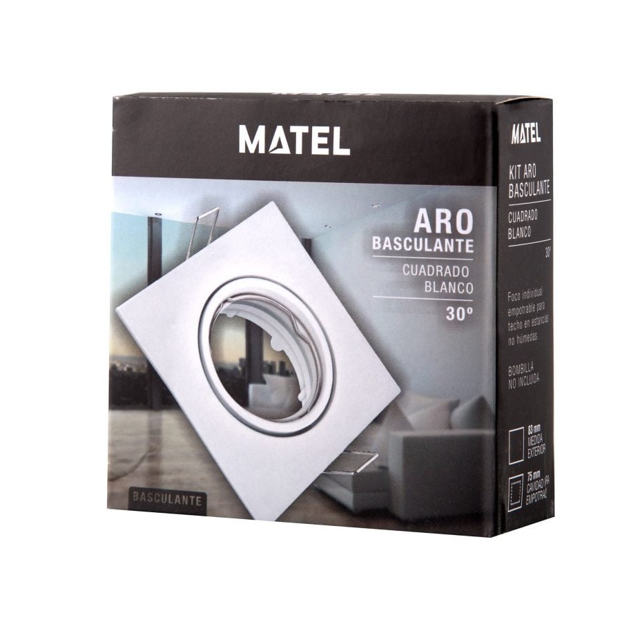 Kit aro empotrable para hueco de 75 mm. Basculante en un ángulo de 30º. Cuerpo metálico con acabado blanco. Para instalación de bombillas dicroicas. Aro con bombilla no incluida. Dimensiones: Exterior 83 mm Ø Hueco: 75 mm