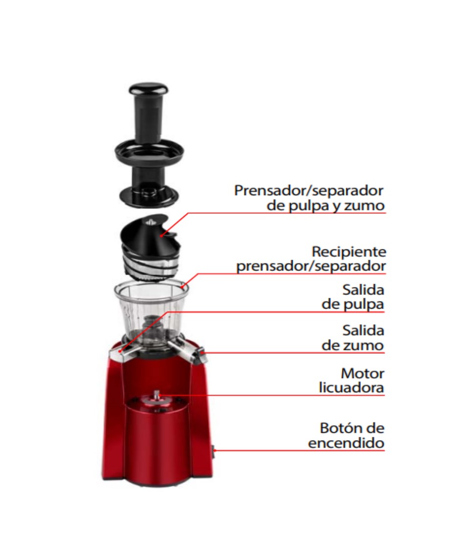 Sistema de prensado en frío Slow Juicer, extrae la mayor cantidad de zumo a frutas y verduras con presión suave en frío, manteniendo sus propiedades naturales y evitando que los alimentos se oxiden.