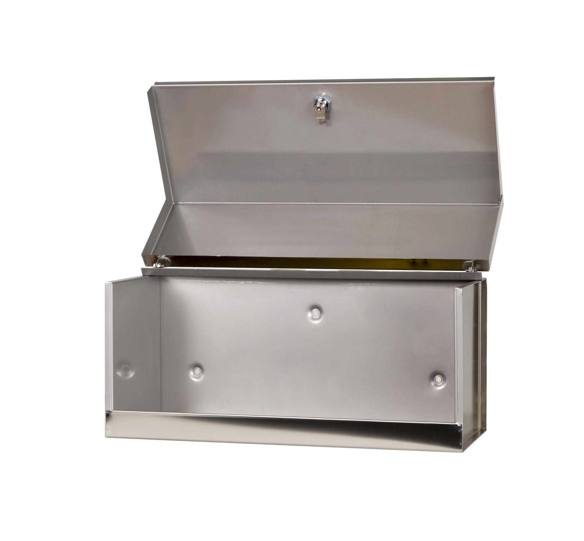 Panera con cerradura y llave. Fabricada en acero inoxidable AISI-304, material que dispone de Certificado Europeo de Calidad. Dispone de unas pequeñas protuberancias en la base que protegen el pan si caen en su interior pequeñas gotas de agua. Con sistema de anclaje a pared mediante tornillos (tornillos incluidos).