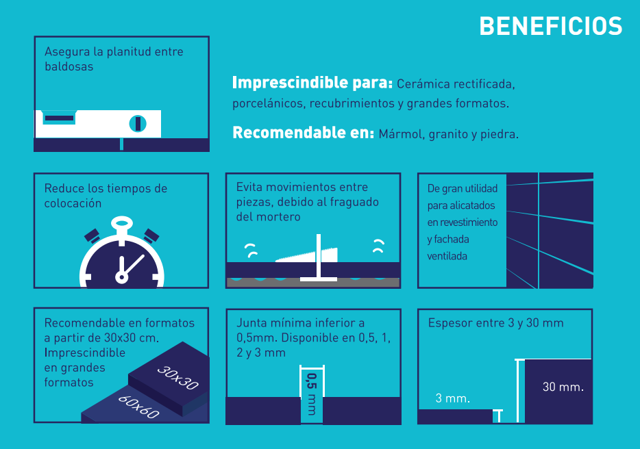El uso de sistemas de autonivelación es altamente recomendable para la instalación de cerámica de cualquier formato, pero imprescindible para la colocación de piezas complejas, pesadas o de grandes dimensiones.