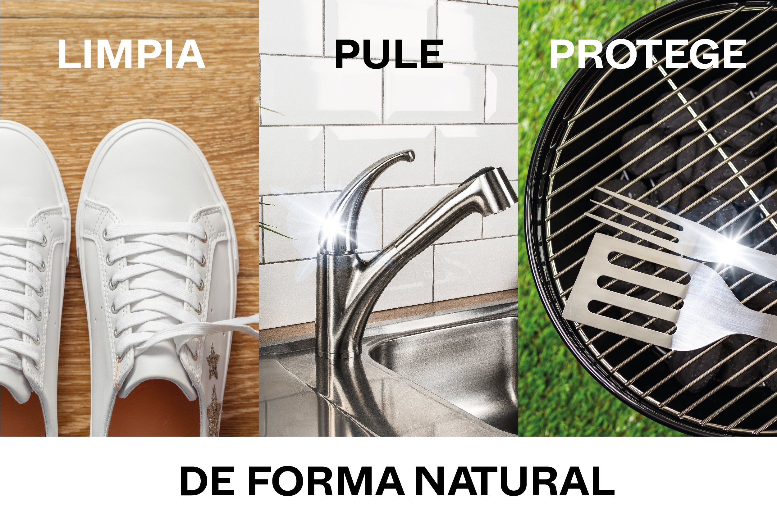Desengrasa, reaviva y protege plata, cobre, cromo, acero inoxidable, estaño, cuero, aluminio, acrílicos, placas vitrocerámicas, azulejos, etc.