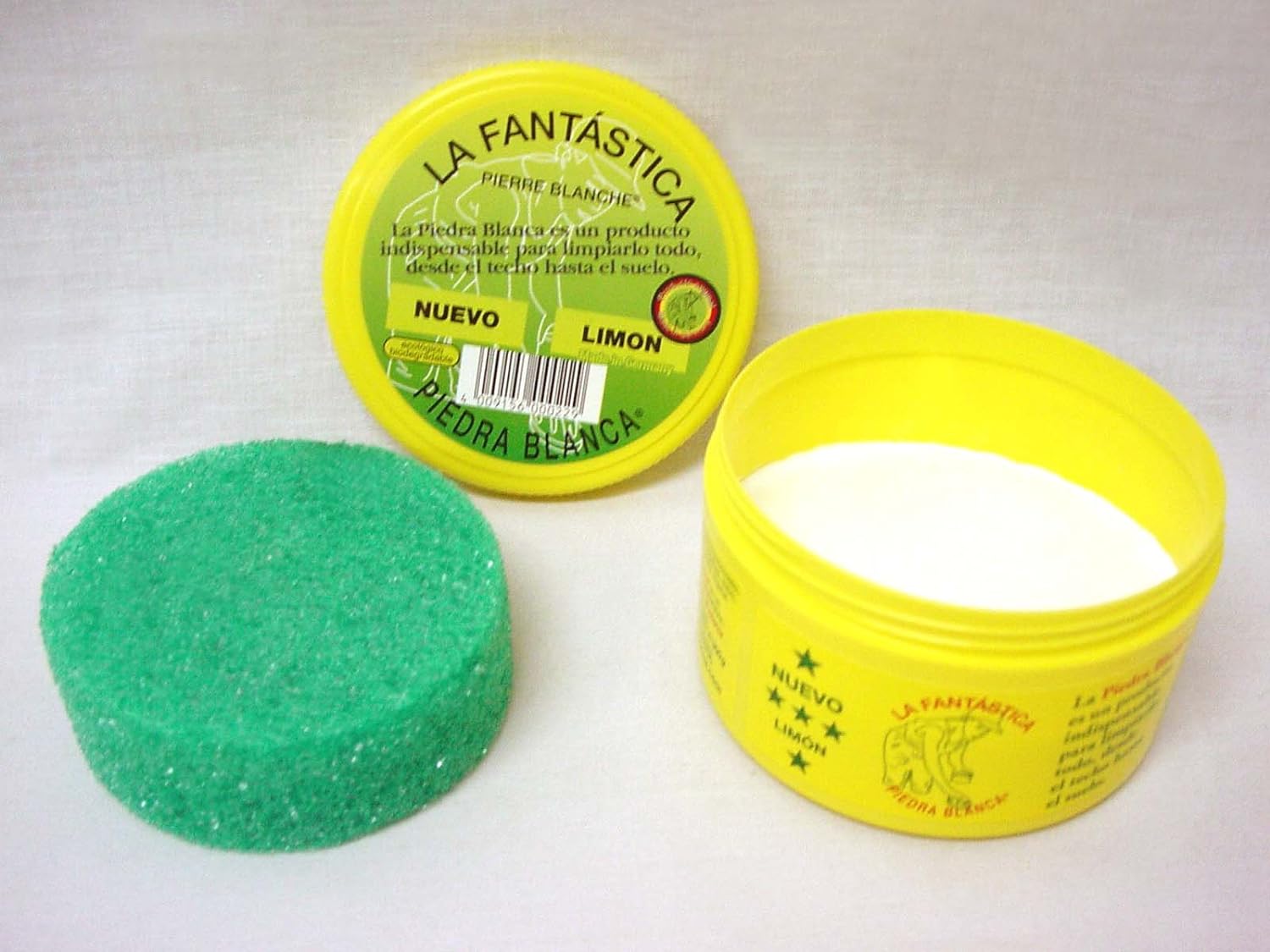 Utilización La piedra blanca se utiliza pasando su esponja humedecida con un poco de agua sobre la piedra, presionando hasta obtener espuma. Frotar la superficie a tratar y aclarar con agua limpia.