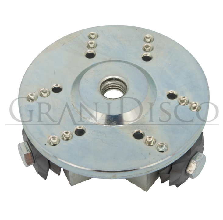 Plato de abujardar con coronas/espuelas de widia para utilizar en pulidoras manuales y abujardar todo tipo de piedra.