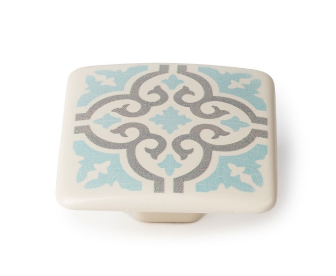 Pomo en forma cuadrada simulando los diseños en mosaico de azulejos pero fabricados en Zamak.