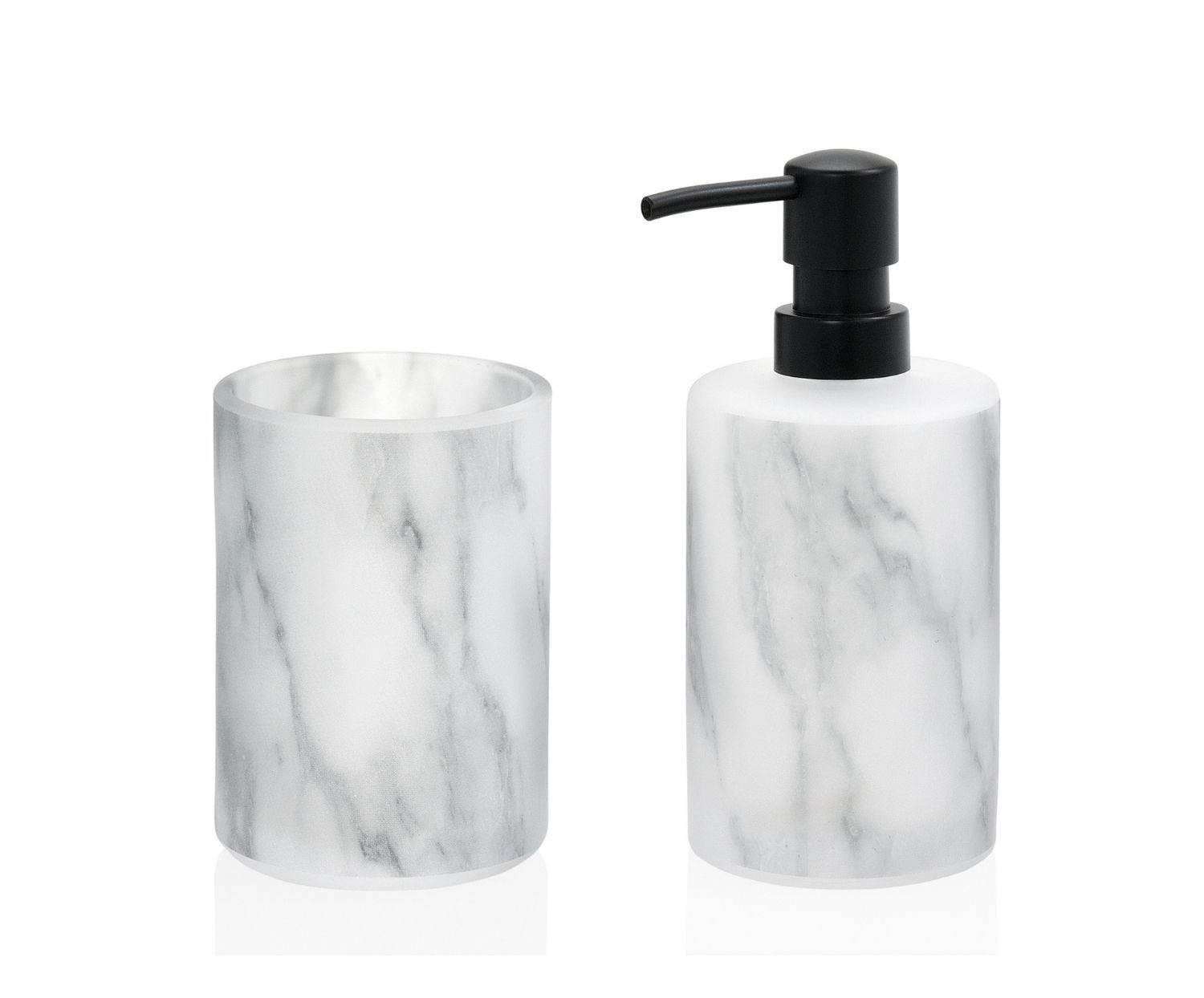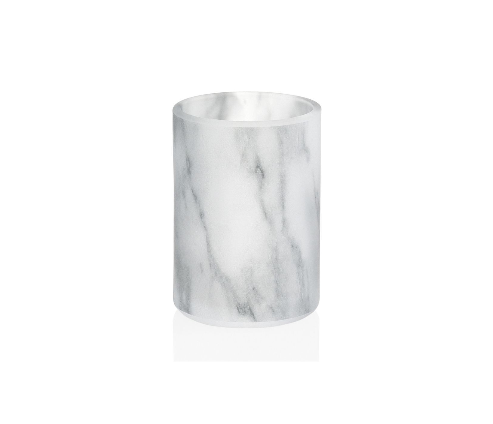 Este portacepillos de vidrio efecto mármol va a juego con un dispensador de jabón para manos y da una nota de originalidad al cuarto de baño de los más exigentes.
