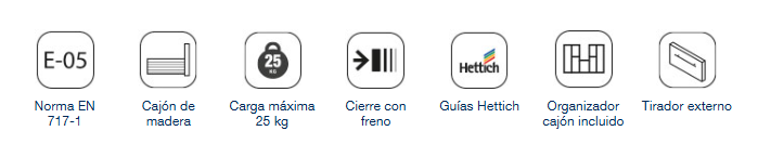 Además, incluye el organizador de cajón e incorpora guías HETTICH con cierre amortiguado.