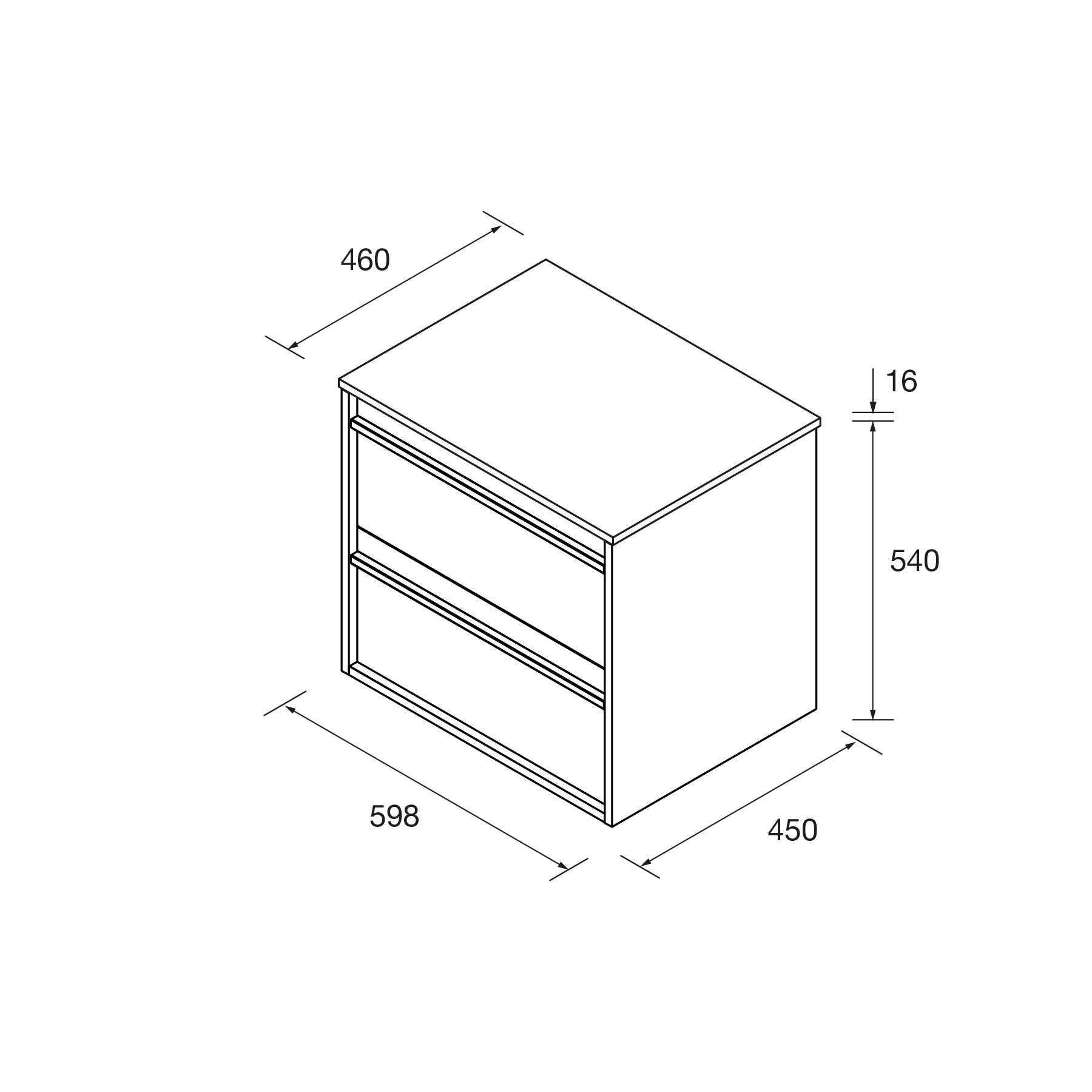 - Frente y laterales fabricados en tablero de partículas laminado de 16 mm (clase E-1) con cantos en PVC (con cola PUR).