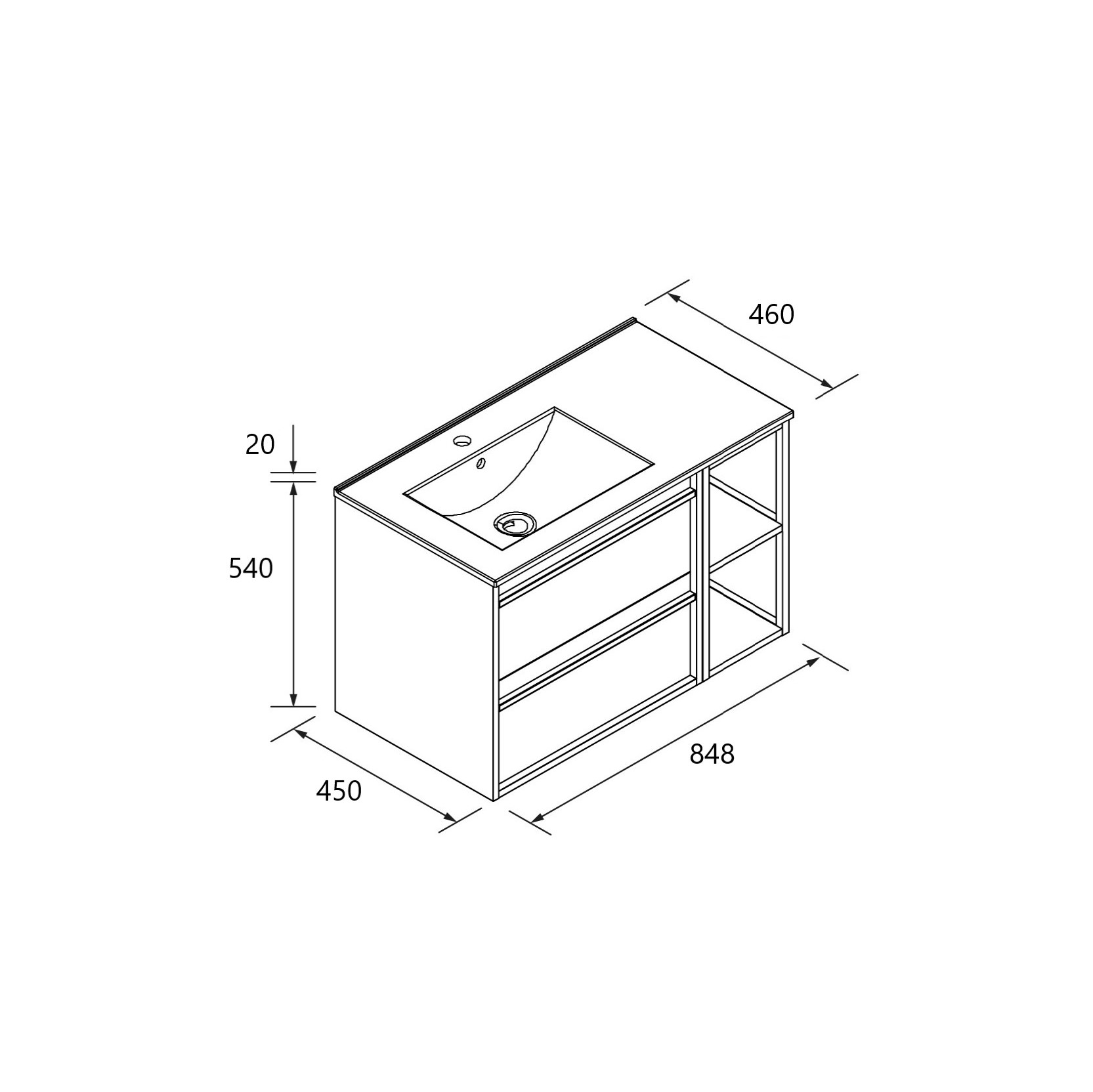 El conjunto de mueble de baño está formado por el mueble de baño, lavabo con seno desplazado integrado y coqueta.