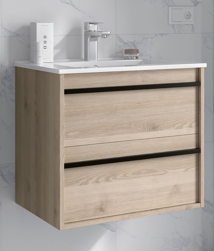 - Mueble de baño de dos cajones con cierre con freno amortiguado para un cierre siempre suave.