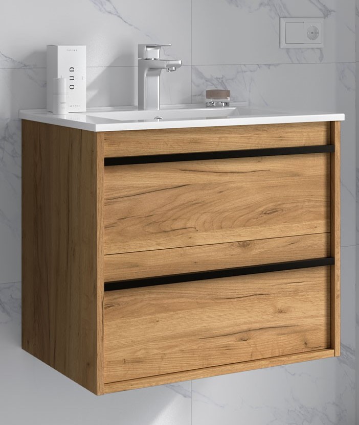 - Mueble de baño de dos cajones con cierre con freno amortiguado para un cierre siempre suave.