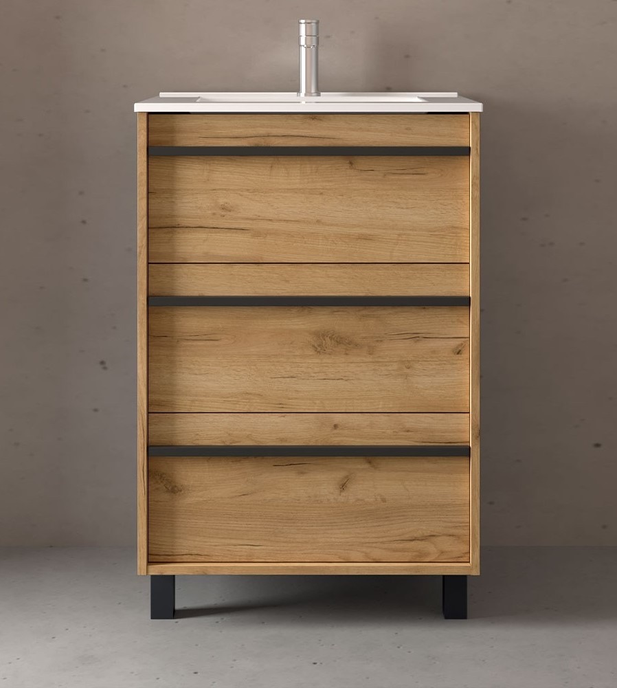 - Mueble de baño de 3 cajones a suelo con cierre con freno amortiguado para un cierre siempre suave.