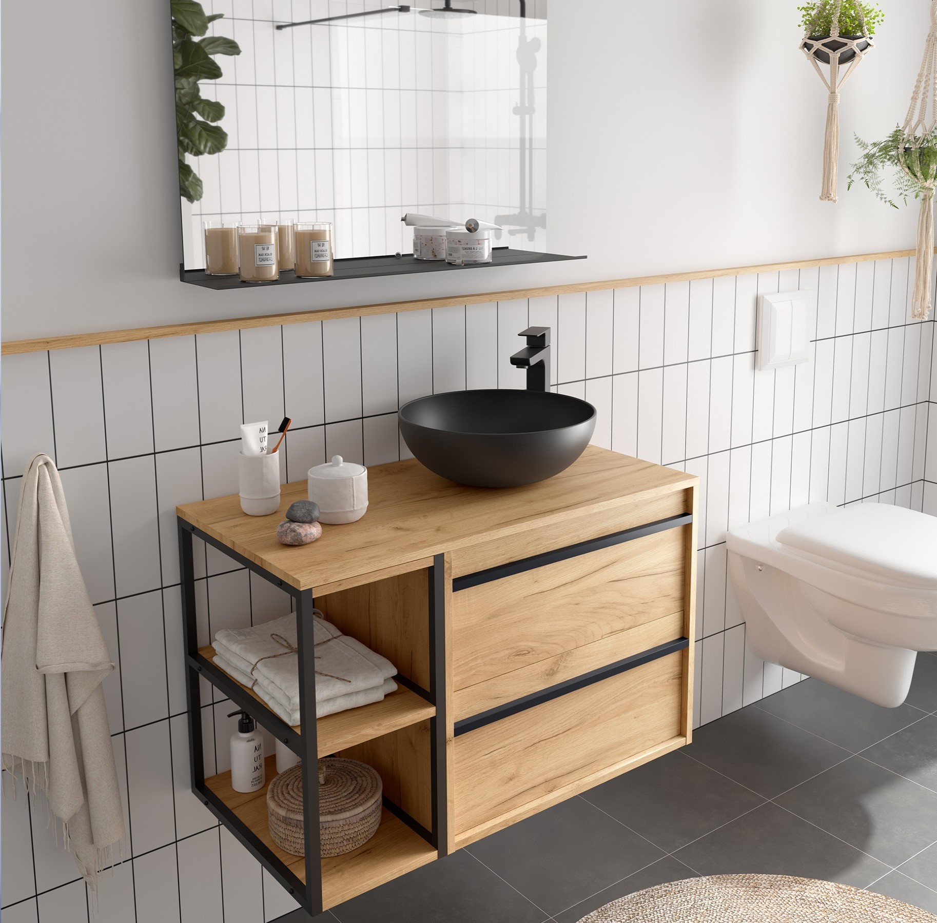 Los muebles de baño ATTILA destacan por su característico tirador negro para los acabados madera y en el mismo acabo del mueble para los acabados mate. Además, incluye el organizador de cajón e incorpora guías HETTICH con cierre amortiguado.