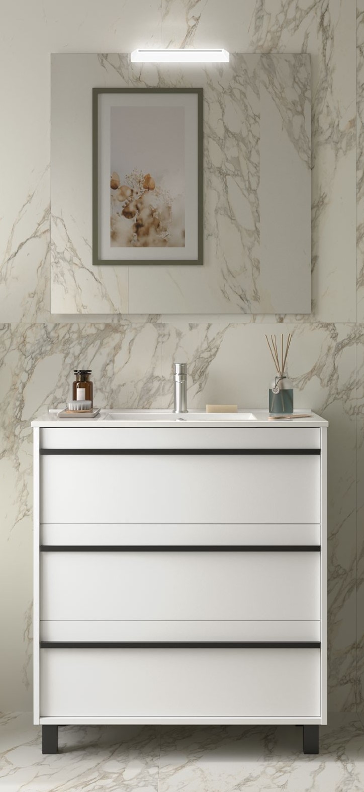 Los muebles de baño ATTILA destacan por su característico tirador negro.