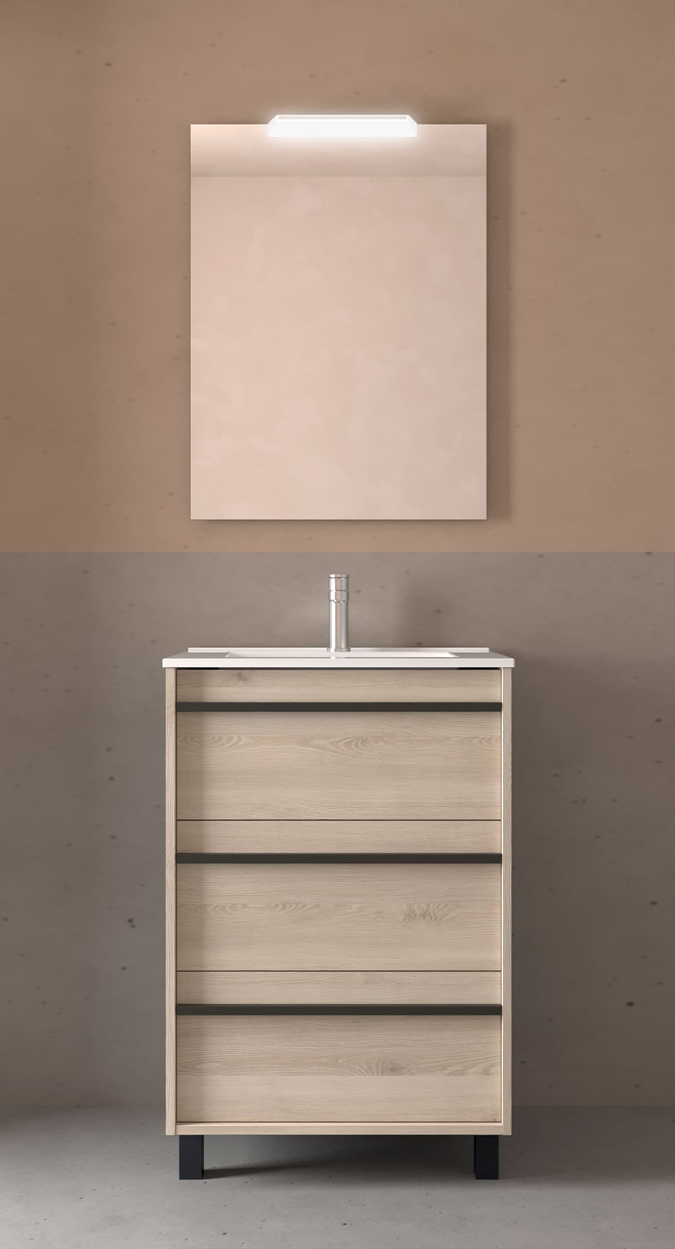 El conjunto de mueble de baño está formado por el mueble de baño, lavabo integrado y un espejo con aplique LED.