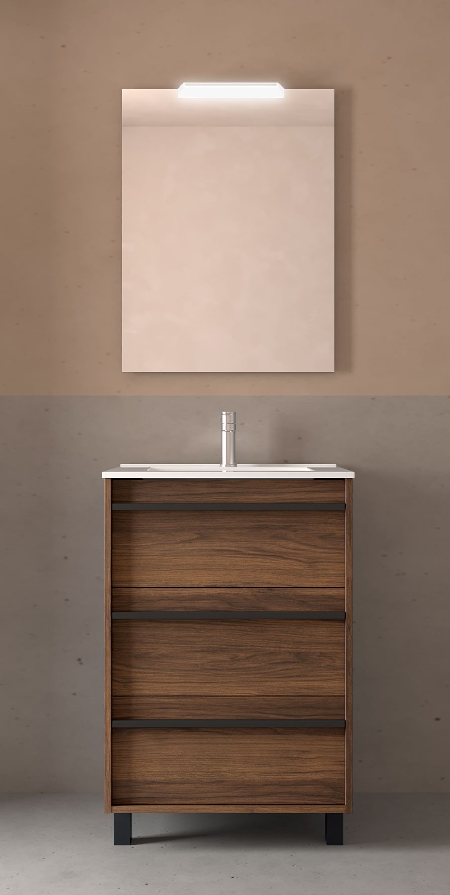 El conjunto de mueble de baño está formado por el mueble de baño, lavabo integrado y un espejo con aplique LED.