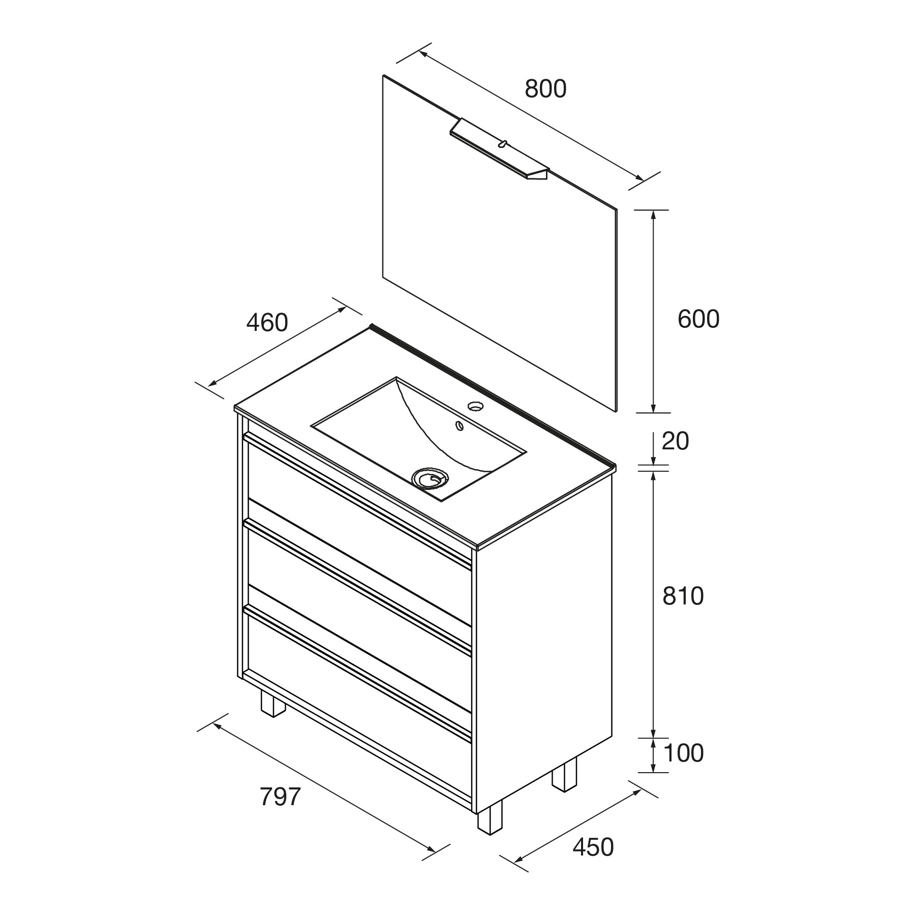 El conjunto de mueble de baño está formado por el mueble de baño, lavabo integrado y un espejo con aplique LED.