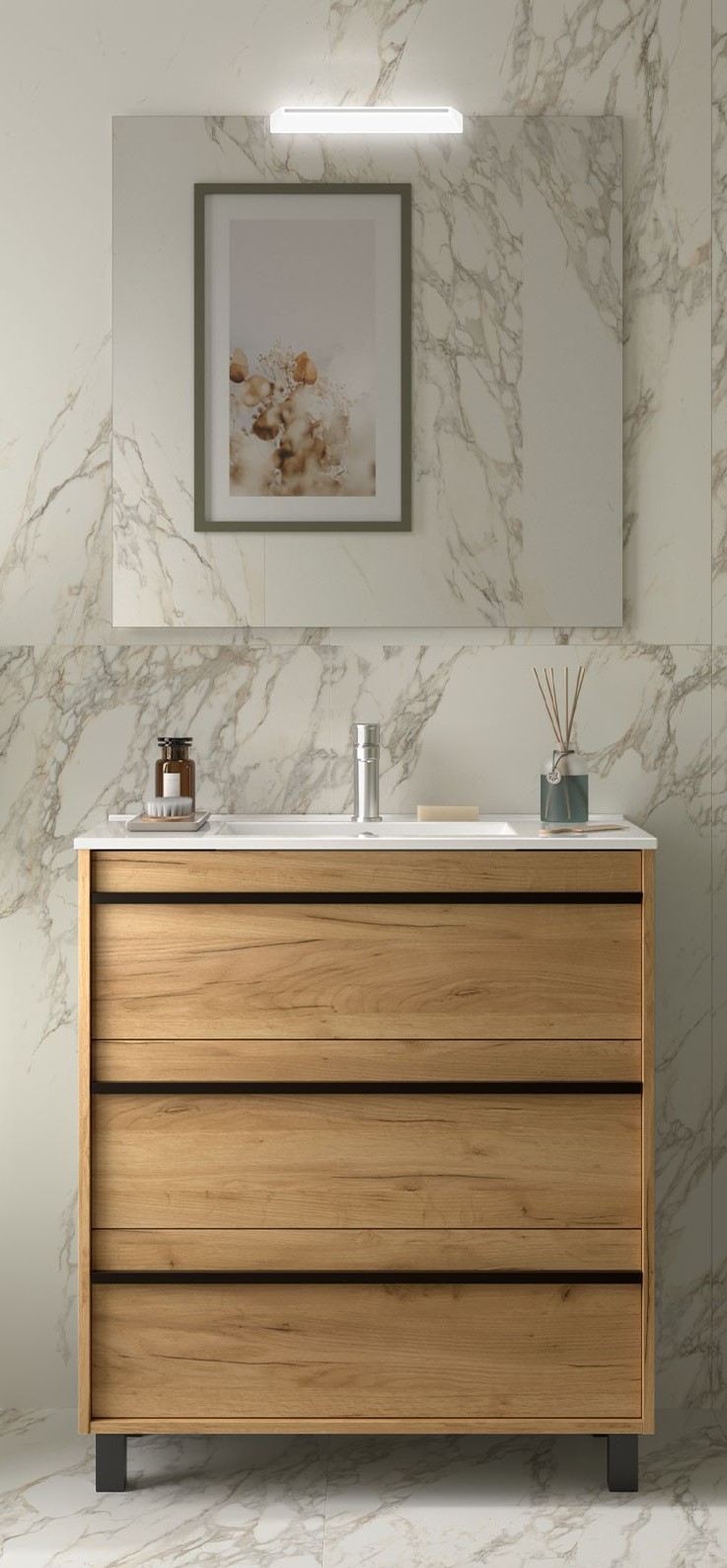El conjunto de mueble de baño está formado por el mueble de baño, lavabo integrado y un espejo con aplique LED.