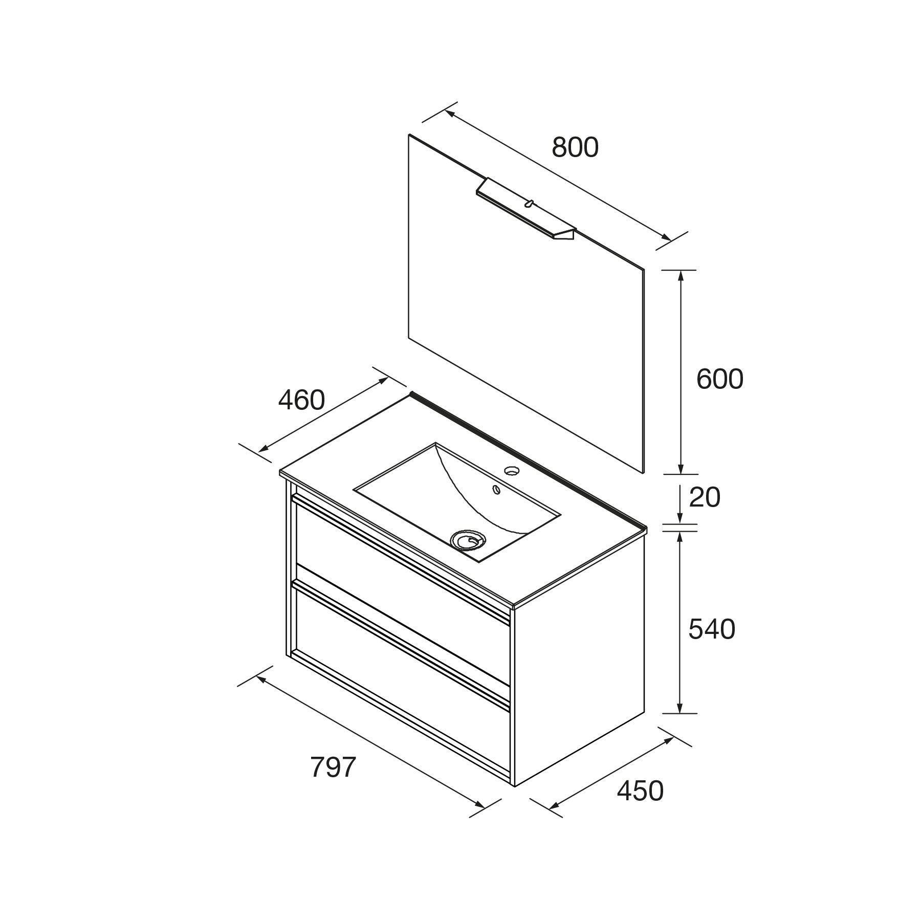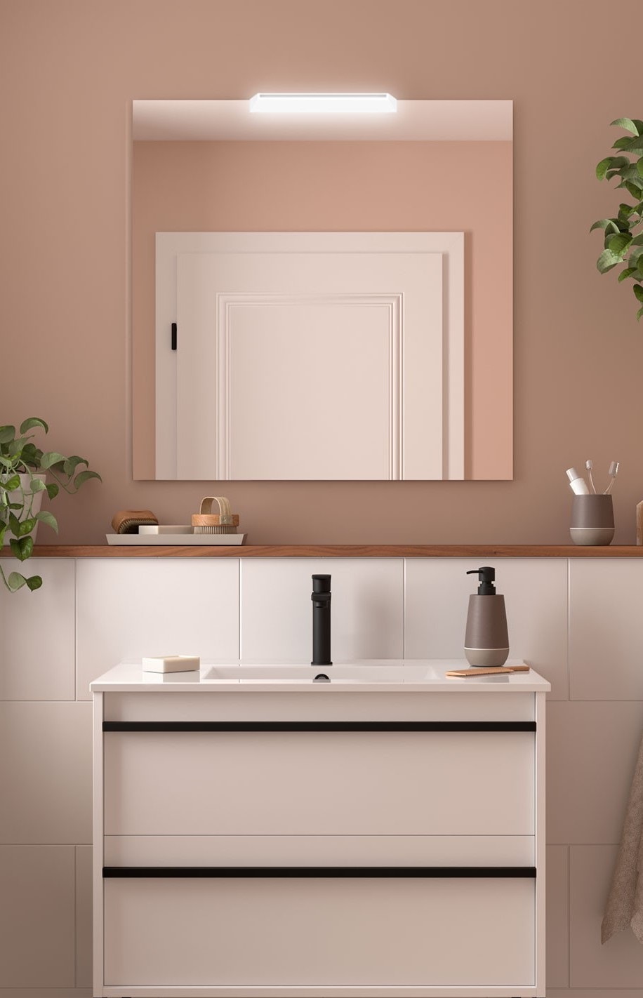 El conjunto de mueble de baño está formado por el mueble de baño, lavabo integrado y espejo con aplique LED.