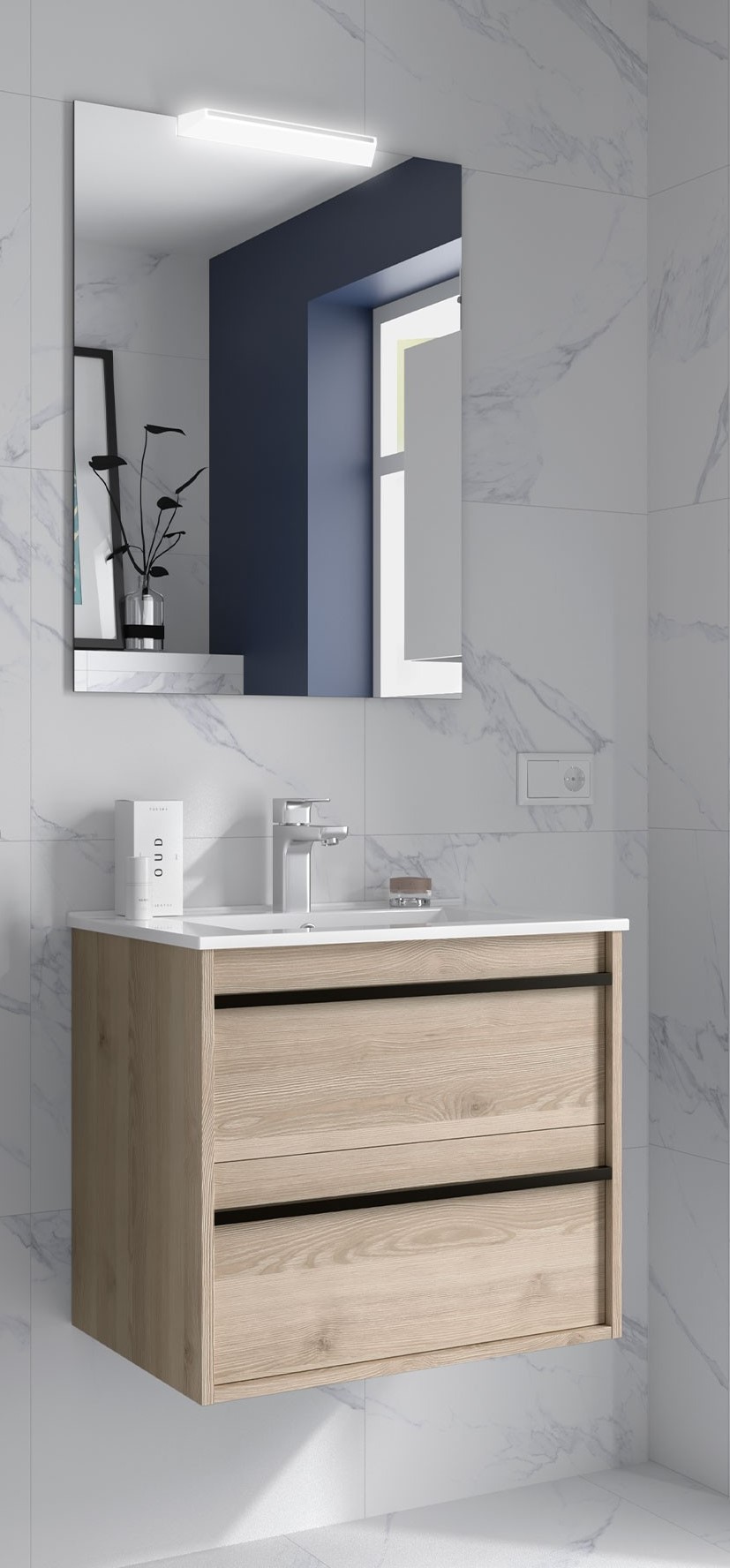 El conjunto de mueble de baño está formado por el mueble de baño, lavabo integrado y espejo con aplique LED.