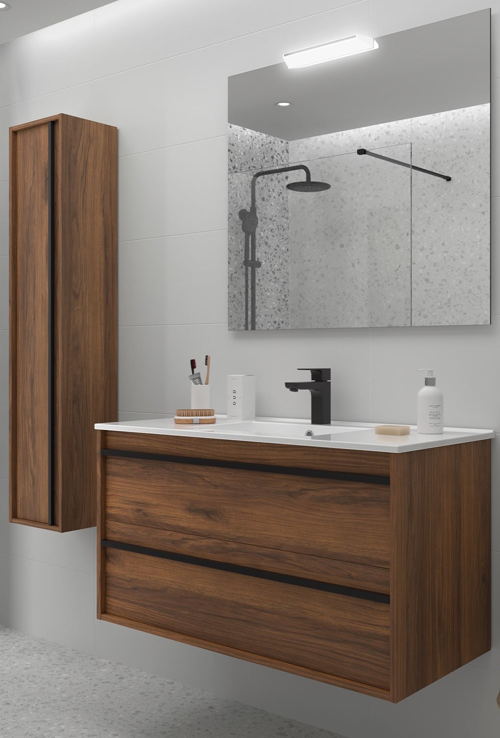 Los muebles de baño ATTILA destacan por su característico tirador negro.