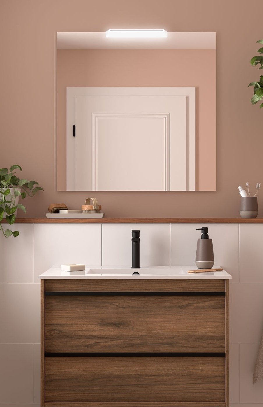 El conjunto de mueble de baño está formado por el mueble de baño, lavabo integrado y espejo con aplique LED.