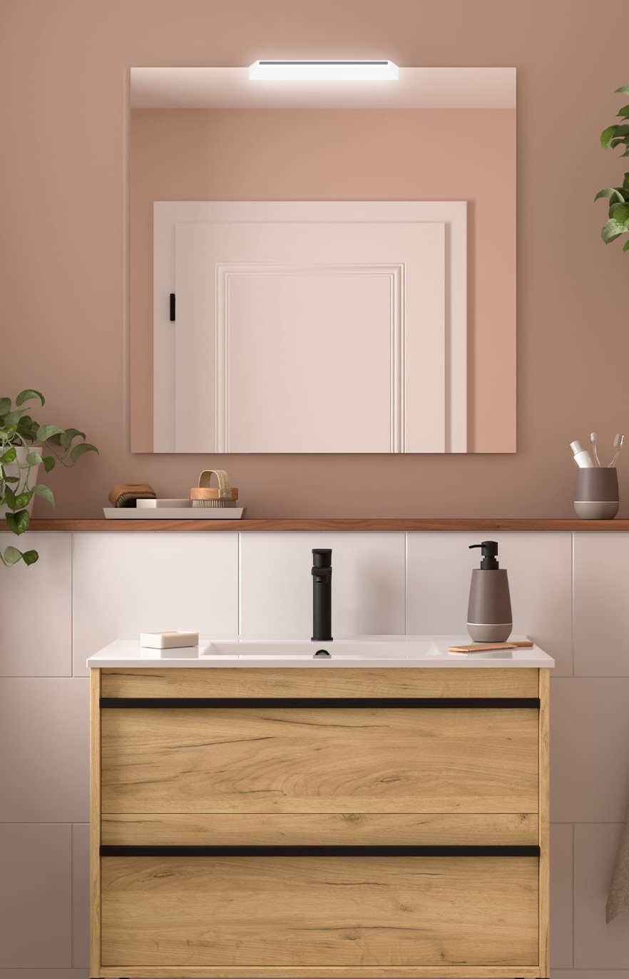 El conjunto de mueble de baño está formado por el mueble de baño, lavabo integrado y espejo con aplique LED.