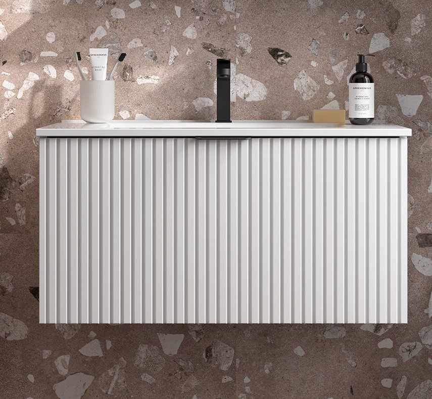 iva incl.Este mueble de baño con sus frentes con tecnología 3D, con ranuras verticales, aportan un toque de diseño y personalidad a tu baño.