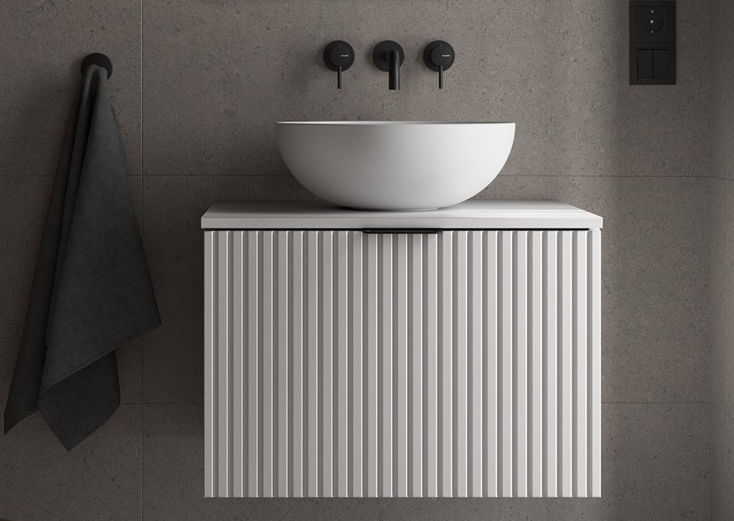 iva incl.Este mueble de baño con sus frentes con tecnología 3D, con ranuras verticales, aportan un toque de diseño y personalidad a tu baño.